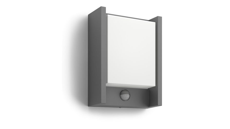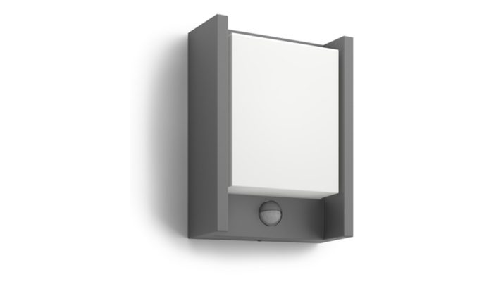 Antracito pilkumo „Philips Arbour“ šviesos diodų sieninis lauko šviestuvas įrėmina šviesos juostą patvariame lieto aliuminio korpuse ir turi judesio jutiklį. Šis šviesos paveikslas apšvies jūsų kiemo erdvę išsklaidyta šaltai balta šviesa.